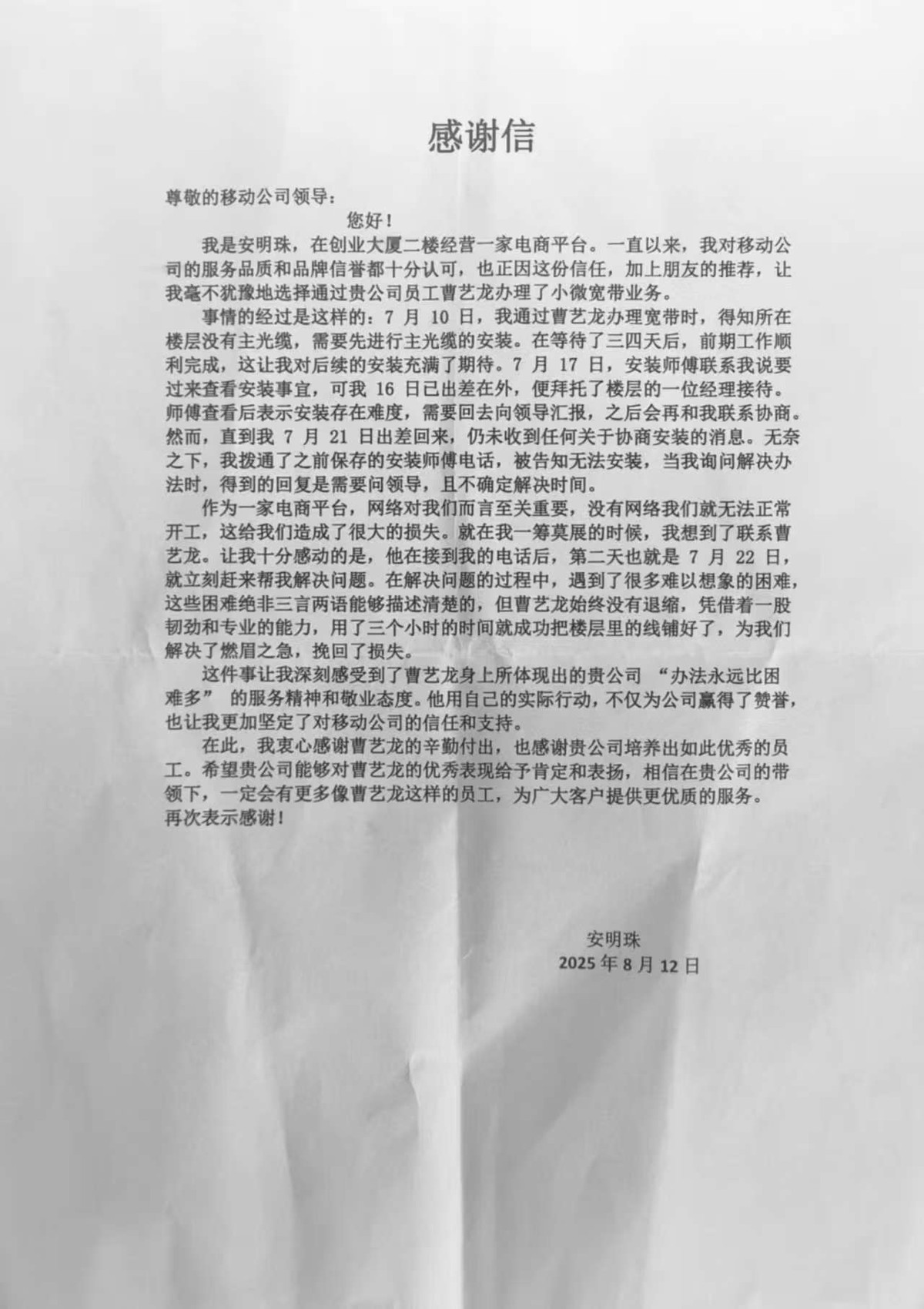 “多亏了小曹的敬业付出,解了我们的燃眉之急!”安女士在感谢信中动情写道。为表谢意,她不仅亲手送上锦旗,还向移动公司领导致信,高度赞扬曹艺龙“专业、耐心、尽责”的服务精神。