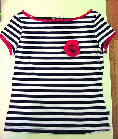 蓝白相间的条纹T恤,典型的海魂衫look,为了削弱条纹的男孩子气,特地在镶边上采用了红色并且点缀一朵红色的小花。仿佛是在告诉你下装搭配红色会很专业哦。条纹T恤/ONLY/¥79