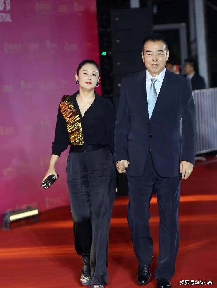 陈红这一身黑色系的搭配也很有时尚感,在黑色衬衫的单侧肩头拼接了立体褶皱的金色荷叶边,这种不对称设计打破了黑色的沉闷感,让视觉焦点自然落在肩颈线条上。金色荷叶边的立体褶皱自带光泽感,与她白皙的皮肤形成鲜明对比,既提亮了整体气色,又不会因为大面积亮色显得浮夸。