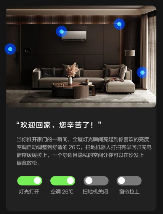 例如,对于“我回来了”这一语音指令,可设置“客厅灯具开启”、“空调制冷至26度”、“窗帘关闭”等一系列指令。这样一来,当用户回家之时,只要说一句“我回来了”,就会瞬间获得一个温度适宜、灯光温暖的家。